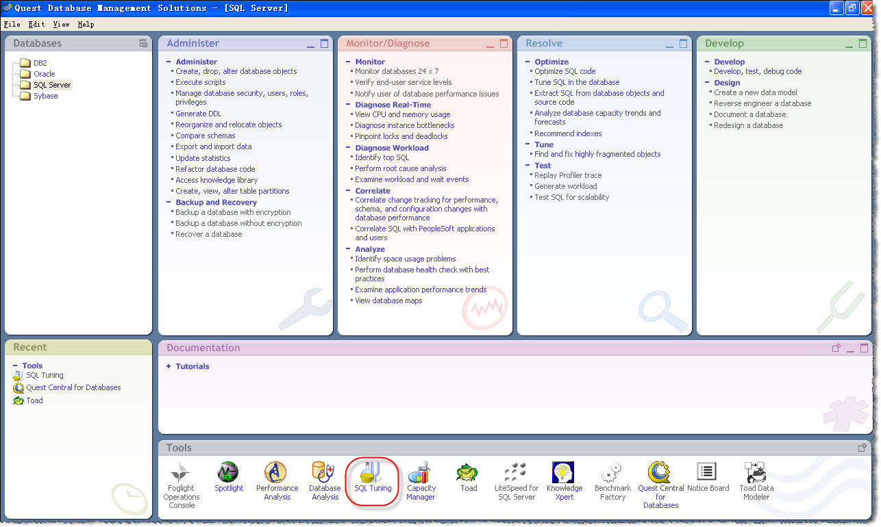 SQL Turning 是Quest公司出品的Quest Central软件中的一个工具。Quest Central是一款集成化、图形化、跨平台的数据库管理解决方案,可以同时管理 Oracle、DB2 和 SQL server 数据库。
