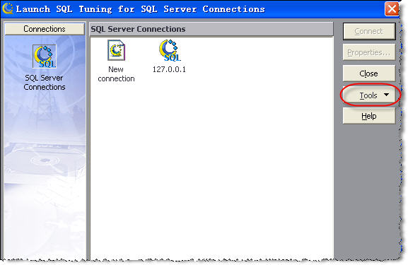 在Quest Central主界面上的“Database”树上选择“SQL Server”,然后在下方出现的“Tools”框中选择“SQL Tuning”选项,打开“Lanch SQL Tuning for SQL Server Connections”对话框(图2、图3)。我们在这里建立数据库服务器的连接,以后的分析工作都会在它上面完成。
