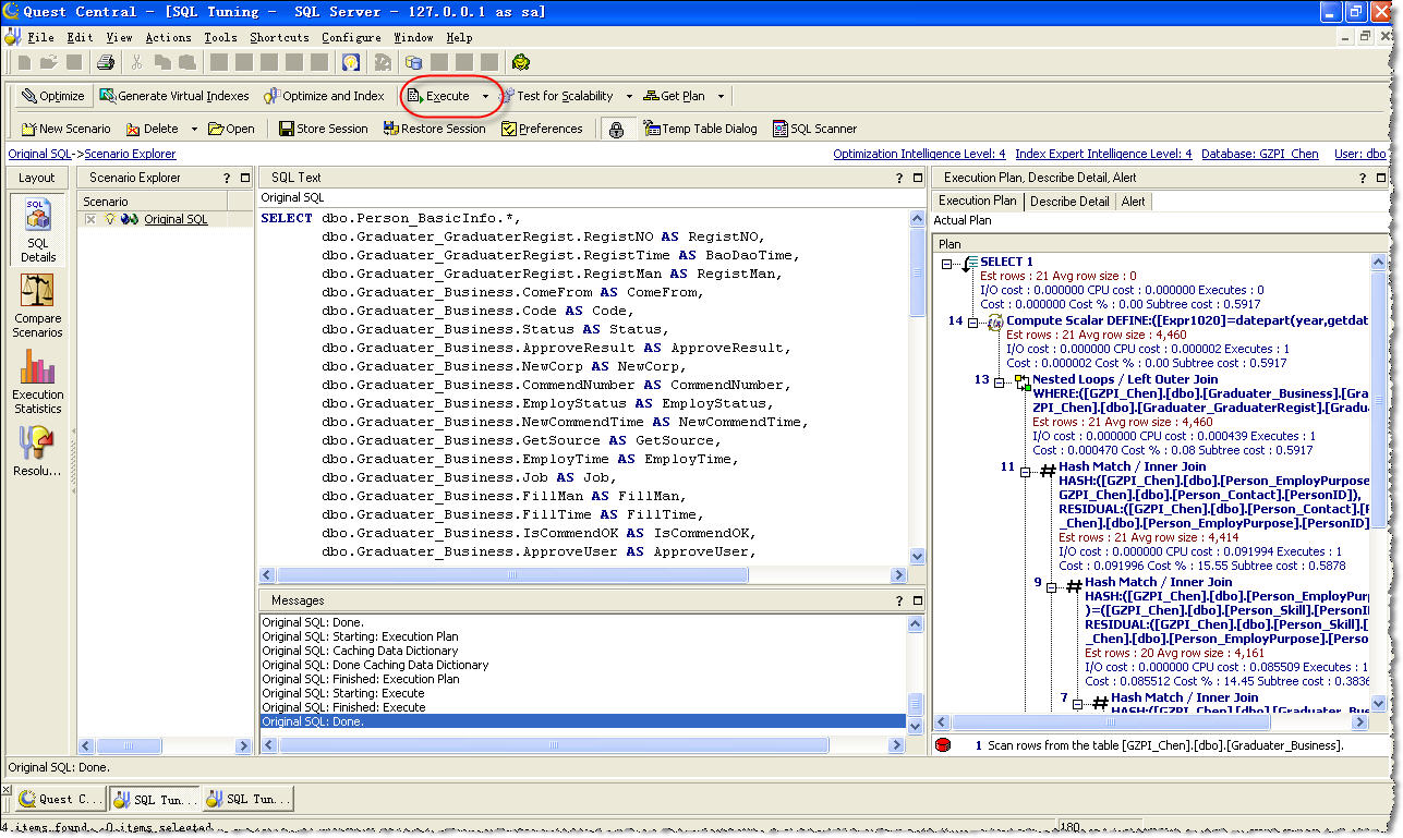 然后点击工具栏上的“Execute”按钮,执行原始的SQL语句,SQL Tuning会自动分析SQL的执行计划,并把分析结果显示到界面上(图5)。