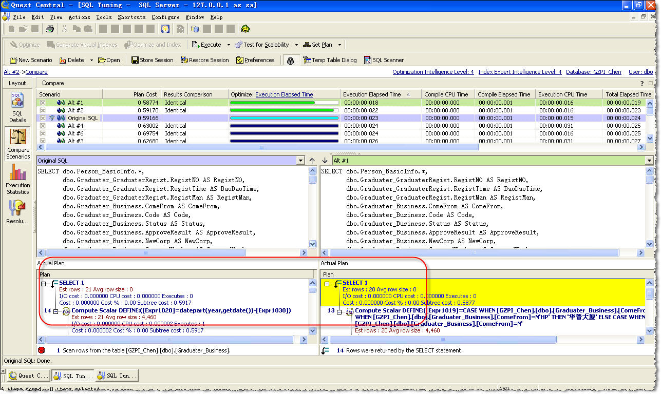 通过上面的步骤,我们已经可以实现自动优化SQL语句,但更重要的是,我们还可以学习如何书写这样高性能的SQL语句。点击界面左方的“Compare Scenarios”按钮,我们可以比较优化方案和原始SQL中的任意2条SQL语句,SQL Tuning会将它们之间的不同之处以不同颜色表示出来,