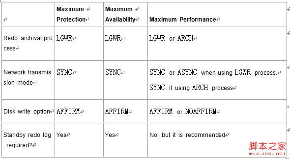 无论使用哪种模式,都要使用LOG_ARCHIVE_DEST_n来配置,上表显示它们之间的关系。可以看出,最大保护和最高可用性的配置一模一样(因为最高可用性在正常情况下就是最大保护):必须使用LGWR进程传输Redo,网络传输模式必须是sync,磁盘写选项AFFIRM,必须配置standby redo log。