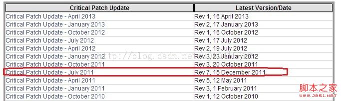 到Oracle CPU主页 ,可以看到每个季度发布的CPU补丁列表(如下图所示),根据你的需要选择相应的CPU补丁即可,这里选择July2011年的补丁。