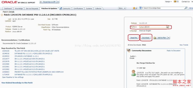 点击上面的版本号,会自动跳到Oracle Support下载页面,如下图所示。选择相应的平台后,点击Readme可以查看Readme文档,点击Download下载