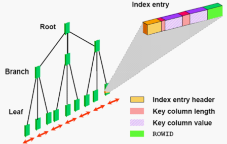 Root为根节点,branch 为分支节点,leaf 到最下面一层称为叶子节点。每个节点表示一层,当查找某一数据时先读根节点,再读支节点,最后找到叶子节点。叶子节点会存放index entry (索引入口),每个索引入口对应一条记录。
