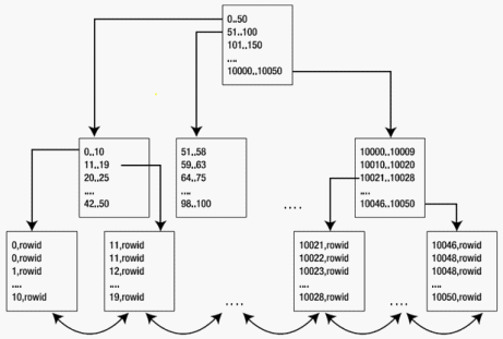 跟节点记录0至50条数据的位置,分支节点进行拆分记录0至10.......42至50,叶子节点记录每第数据的长度和值,并由指针指向具体的数据。