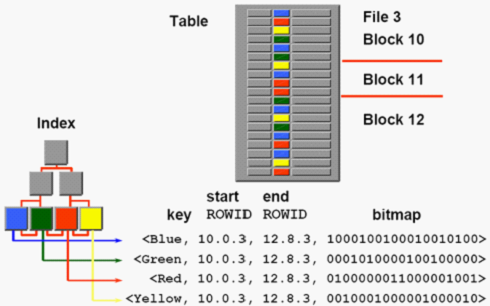 从上图,我们可以看出,一个叶子节点(用不同颜色标识)代表一个key , start rowid 和 end rowid规定这种类型的检索范围,一个叶子节点标记一个唯一的bitmap值。因为一个数值类型对应一个节点,当时行查询时,位图索引通过不同位图取值直接的位运算(与或),来获取到结果集合向量(计算出的结果)。