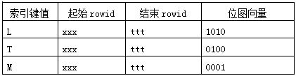 对两个数据列A、B分别建立位图索引:idx_t_bita和idx_t_bitb。两个索引对应的存储逻辑结构如下: