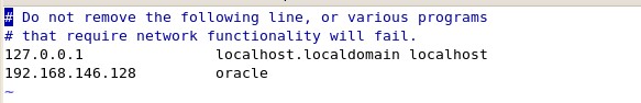 $ vi /etc/hosts 修改hosts的配置文件删除最后一行的内容,在最后一行加上主机的IP地址和主机名,并将第三行IP地址上面你的主机名给删除,不能让两个IP地址都对应同一个主机名,也就是不能有两个oracle出现。配置好了如下。