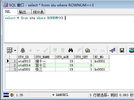 /*取出前3行数据*/ select * from stu where ROWNUM<=3
