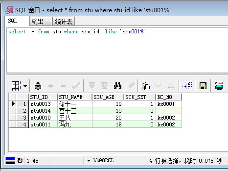 /*模糊查询*/ select * from stu where stu_id like 'stu001%'