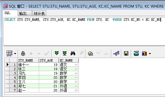 /*普通联合查询*/ SELECT STU.STU_NAME, STU.STU_AGE, KC.KC_NAME FROM STU, KC WHERE STU.KC_NO = KC.KC_NO