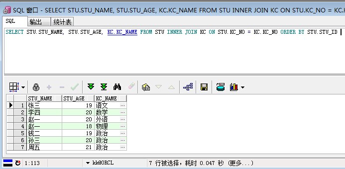 /*联合查询*/ SELECT STU.STU_NAME, STU.STU_AGE, KC.KC_NAME FROM STU INNER JOIN KC ON STU.KC_NO = KC.KC_NO ORDER BY STU.STU_ID