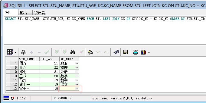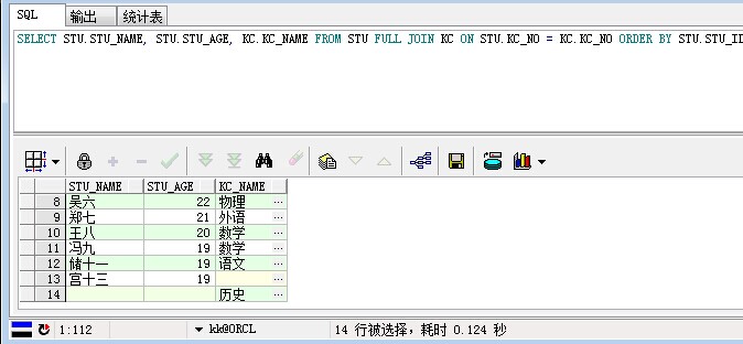 /*全连接*/ SELECT STU.STU_NAME, STU.STU_AGE, KC.KC_NAME FROM STU FULL JOIN KC ON STU.KC_NO = KC.KC_NO ORDER BY STU.STU_ID