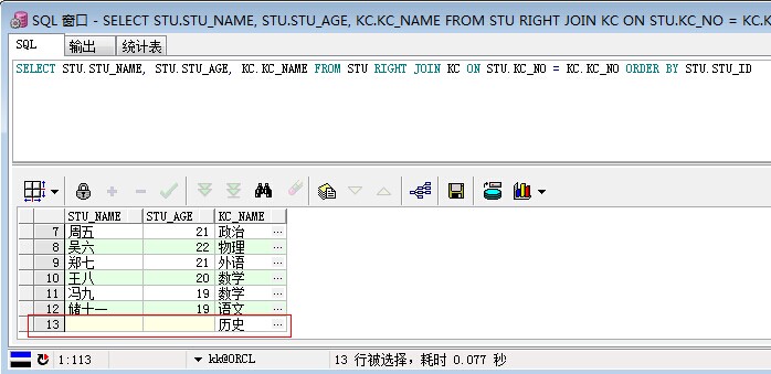 /*右连接*/ SELECT STU.STU_NAME, STU.STU_AGE, KC.KC_NAME FROM STU RIGHT JOIN KC ON STU.KC_NO = KC.KC_NO ORDER BY STU.STU_ID