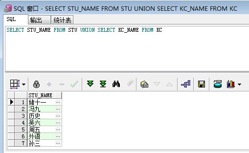 /*UNION关键字,联合两个表某些字段*/ SELECT STU_NAME FROM STU UNION SELECT KC_NAME FROM KC