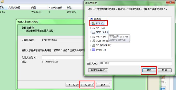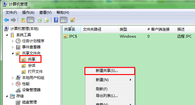 第二步:控制面板>所有控制面板项>管理工具>计算机管理>系统工具>共享文件夹>共享右键单击“共享”>新建共享>