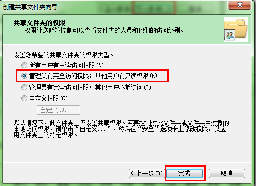 其中共享中权限设置为管理员有完全访问权限;其他用户有只读权限(R)