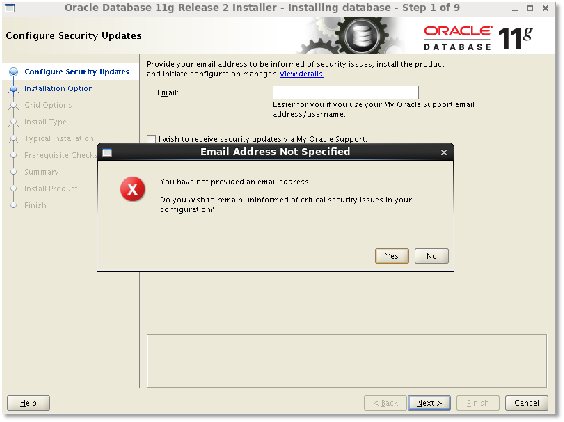 取消勾选,不接收安全更新,然后点击【next】,弹出提示窗口,选择【yes】:
