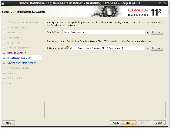 设置Oracle基目录为新建的目录:/home/app/oracle,则软件位置会自动为:/home/app/oracle/product/11.2.0/dbhome_1,然后点击【Next】: