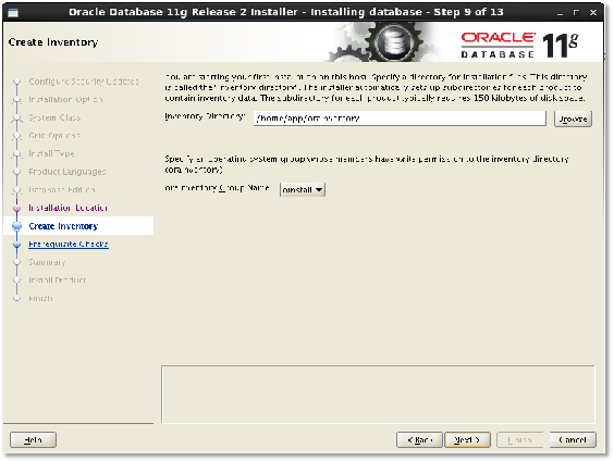 设置Oracle清单目录新建的目录:/home/app/ oraInventory,选择组"oinstall",然后点击【Next】: