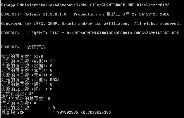 D:\app\Administrator\oradata\orcl>dbv file=ZL9MTLBASE.DBF blocksize=8192;