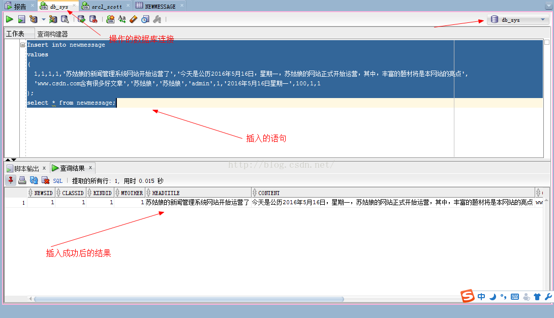 Insert into newmessage values( 1,1,1,1,'苏姑娘的新闻管理系统网站开始运营了','今天是公历2016年5月16日,星期一,苏姑娘的网站正式开始运营,其中,丰富的题材将是本网站的亮点', 'www.csdn.com含有很多好文章','苏姑娘','苏姑娘','admin',1,'2016年5月16日星期一',100,1,1);select * from newmessage;