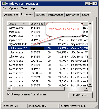 Step 2:打开任务管理器,找到SQL*Plus进程,如果Oracle的客户端为32位,则在Image Name会标记为*32,那么如下图所示:
