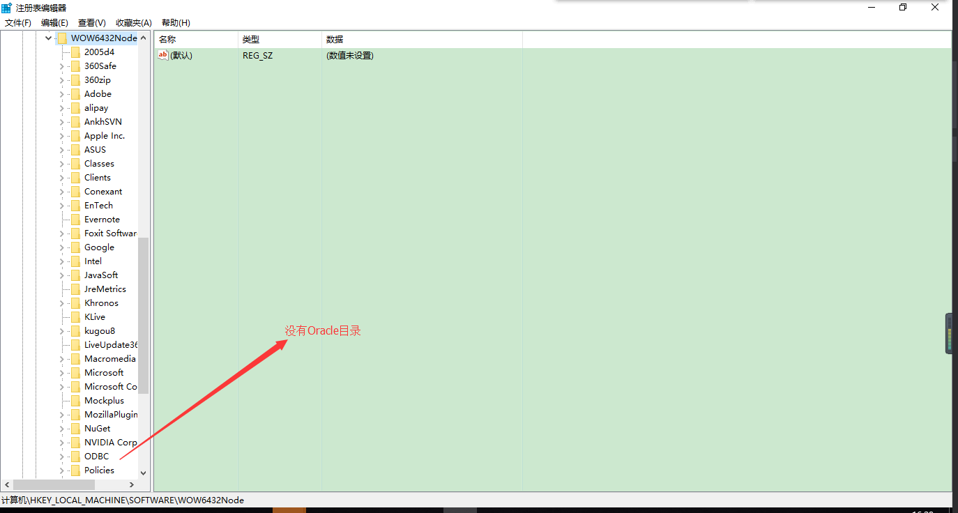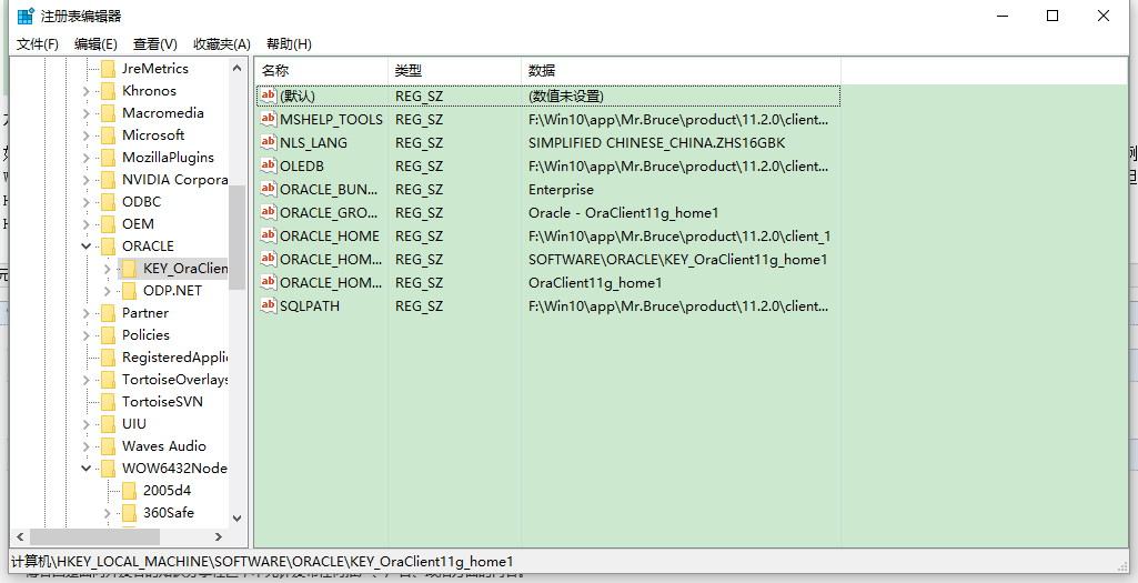 如果操作系统是32位的,那么Oracle客户端也必定为32位,如果操作系统是64位操作系统,那么Oracle客户端则有可能为32位或64位,我们可以通过注册表来查看。例如,我在Windows 10上安装了一个64位的Oracle 11g Client。 运行regedit进入注册表系统,在HKEY_LOCAL_MACHINE\SOFTWARE\ORACLE\下面,你会发现下面没有注册信息,但是HKEY_LOCAL_MACHINE\SOFTWARE\Wow6432Node\ORACLE下就能看到一些详细的注册表信息;如果安装的是64位的Oracle客户端,则注册表信息位于HKEY_LOCAL_MACHINE\SOFTWARE\ORACLE\下,而HKEY_LOCAL_MACHINE\SOFTWARE\Wow6432Node下没有ORACLE目录。