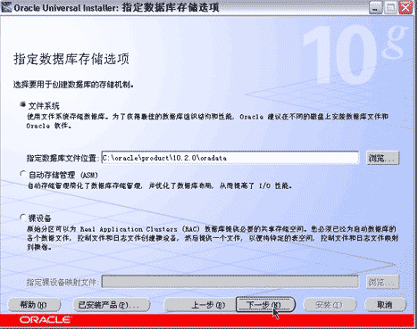 指定数据库存储选项(使用默认选项文件系统即可),按下一步按钮