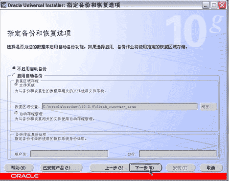 指定备份和恢复选项(使用默认选项不启用自动备份即可),按下一步按钮