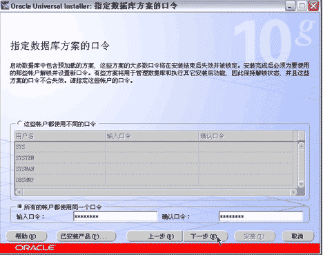 为简化评估用数据库的密码设定,选择所有的帐户都使用同一个口令,输入 SYSTEM 等用户的口令(口令不要以数字开头),并按下一步按钮