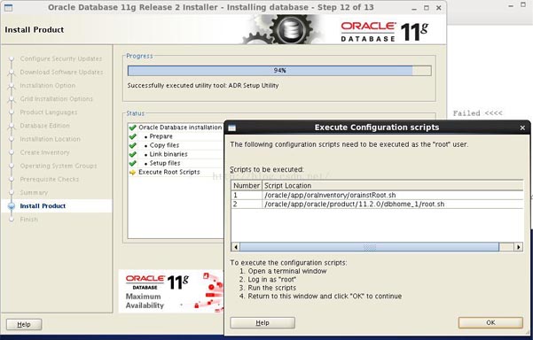 如果安装完成,会弹出ExecuteConfiguration scripts所示,选择OK完成oracle软件安装,如013.png所示: