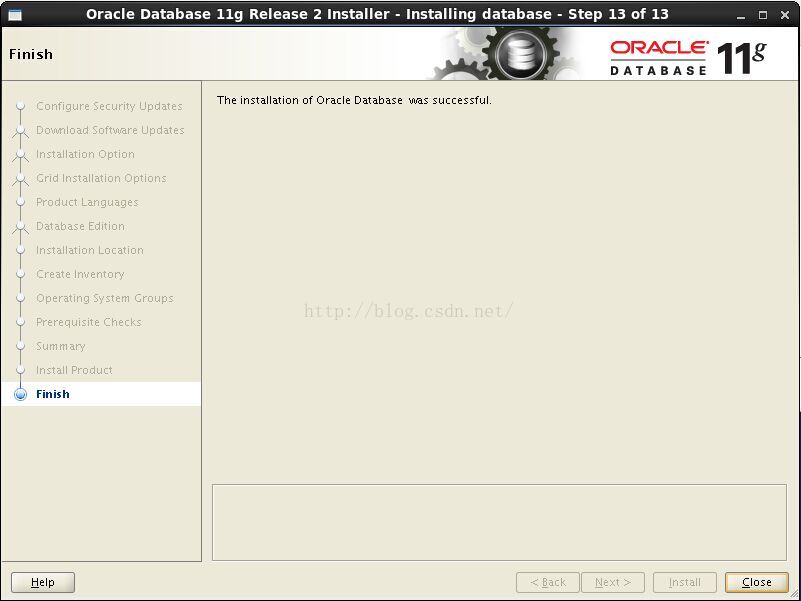之后,看到oracle安装到最好一步Finish,选择close结束,如014.png所示:
