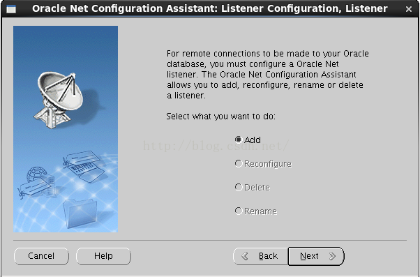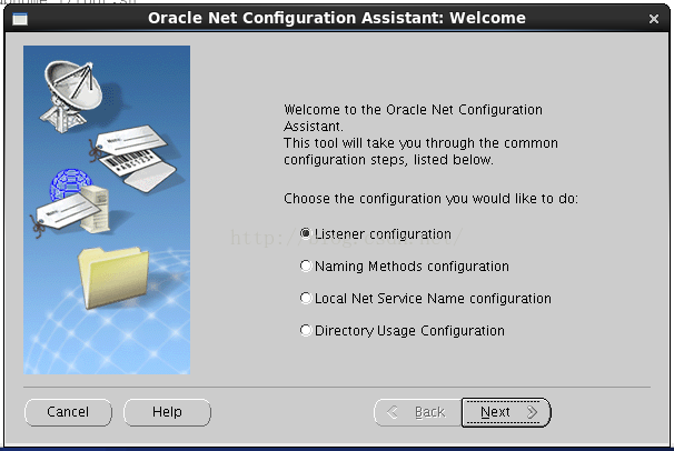在shell命令行sudo – oracle,然后执行netca命令,出现如下界面,选择默认的listener configure配置,如下015.png: