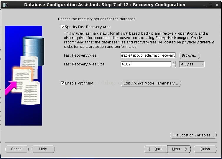 # 修改spfile参数 SQL> alter system set log_archive_dest_1='location=/doea5/arch'; SQL> alter system set log_archive_format='arch_%t_%s_%r.log' scope=spfile; SQL> alter system set db_recovery_file_dest_size=20G scope=spfile; SQL> alter system set db_recovery_file_dest='/oracle/app/oracle/flash_recovery'; SQL> alter system set db_flashback_retention_target=10080 scope=spfile; SQL> alter system set undo_retention=10800; # 打开归档和闪回 SQL> shutdown immediate SQL> startup mount SQL> alter database archivelog ; SQL> alter database flashback on; SQL> alter database open;
