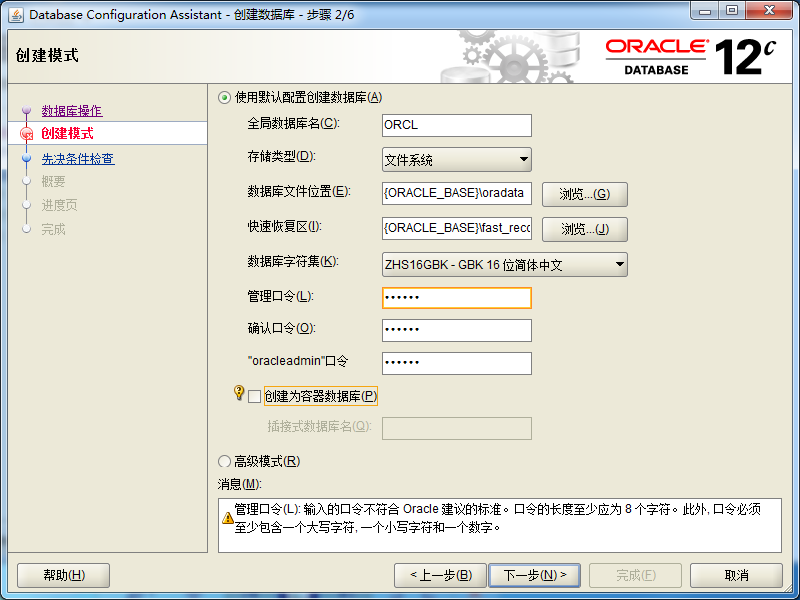 注意:1,数据库名称建议使用ORCL(类似Java中驼峰式命名变量,只是一种习惯)