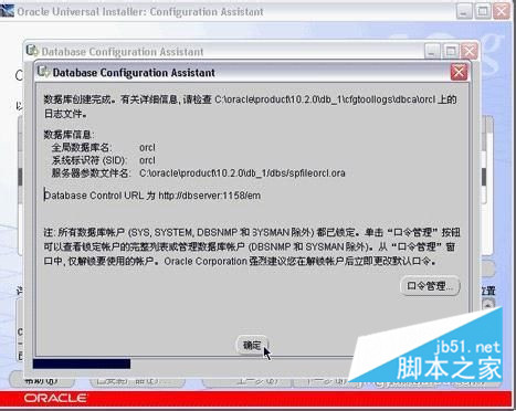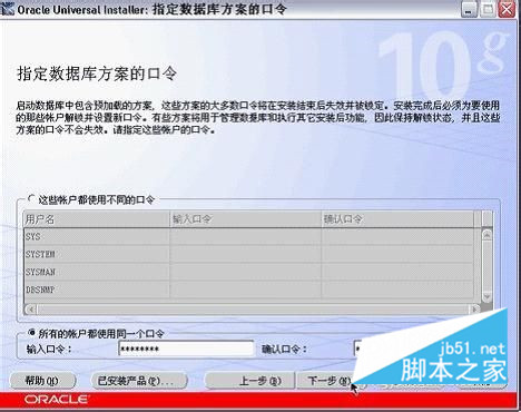 为简化评估用数据库的密码设定,选择所有的帐户都使用同一个口令,输入SYSTEM 等用户的口令(口令不要以数字开头),并按下一步按钮