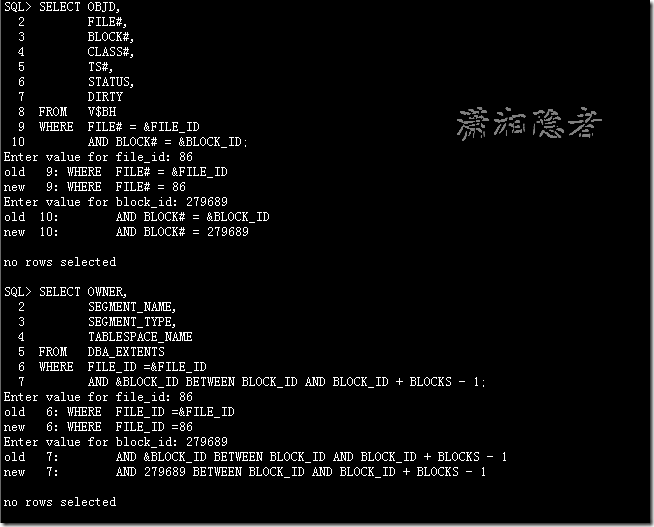 SELECT OWNER, SEGMENT_NAME, SEGMENT_TYPE, TABLESPACE_NAME FROM DBA_EXTENTS WHERE FILE_ID =&FILE_ID AND &BLOCK_ID BETWEEN BLOCK_ID AND BLOCK_ID + BLOCKS - 1;