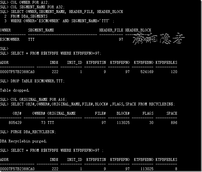 如上所示,清空回收站对象后,你会发现X$KTFBFE中多了一条记录,KTFBFEFNO 和 KTFBFEBNO分别为97 ,113025, 这个值显然就是删除对象TTT曾经的FILE_ID(97)和BLOCK_ID(113025)值。