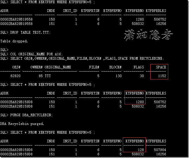 另外,在测试过程中发现,并不是每次的测试结果都是在X$KTFBFE中多一条记录,有时候记录不会变化,但是X$KTFBFE中某条记录的KTFBFEBNO会变化,而这个变化跟清空回收站是有关系的。如下案例所示: