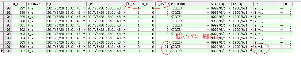 触发器建好了,可以测试插入删除了。先插入100行,再随便删除一些行。