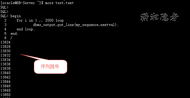 exec dbms_lock.sleep(2); --延迟2秒执行,根据你实验情况调整 / begin for i in 1 .. 2000 loop dbms_output.put_line(my_sequence.nextval); end loop; end; /