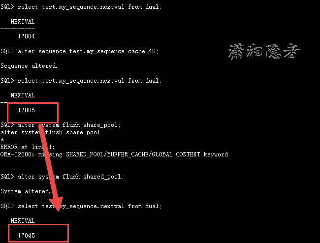 SQL> select test.my_sequence.nextval from dual; NEXTVAL ---------- 17004 SQL> alter sequence test.my_sequence cache 40; Sequence altered. SQL> select test.my_sequence.nextval from dual; NEXTVAL ---------- 17005 SQL> alter system flush share_pool; alter system flush share_pool * ERROR at line 1: ORA-02000: missing SHARED_POOL/BUFFER_CACHE/GLOBAL CONTEXT keyword SQL> alter system flush shared_pool; System altered. SQL> select test.my_sequence.nextval from dual; NEXTVAL ---------- 17045