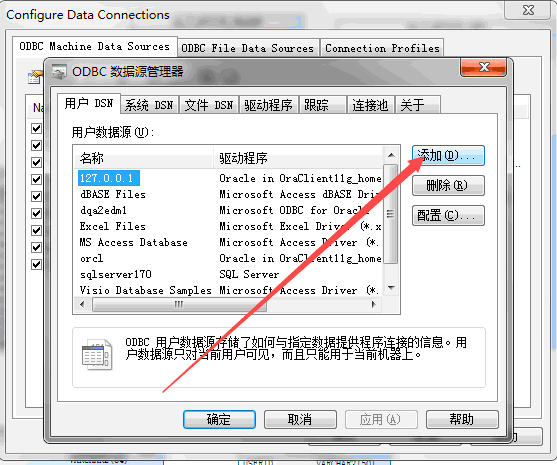 4、打开ODBC 32版本 C:\Windows\SysWOW64\odbcad32.exe,点击添加,选择Oracle in OracleClient_home