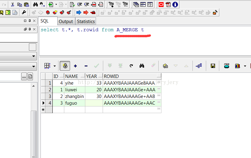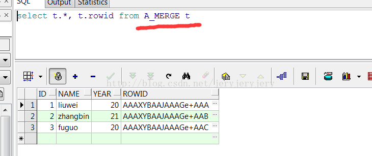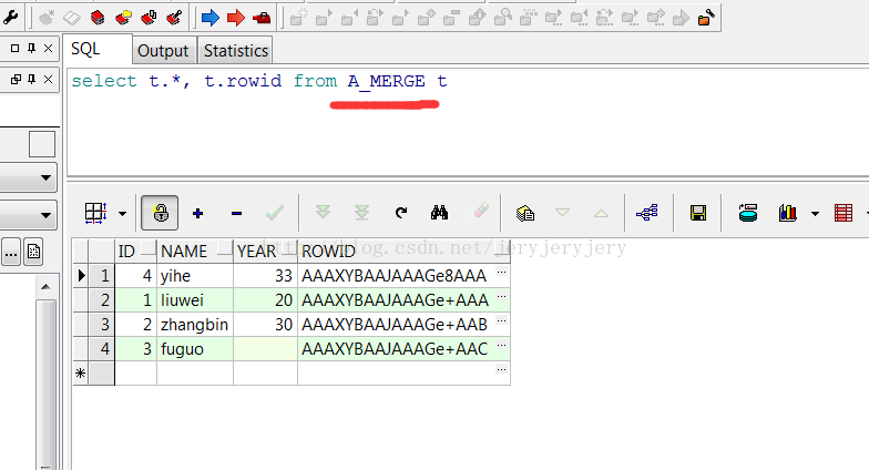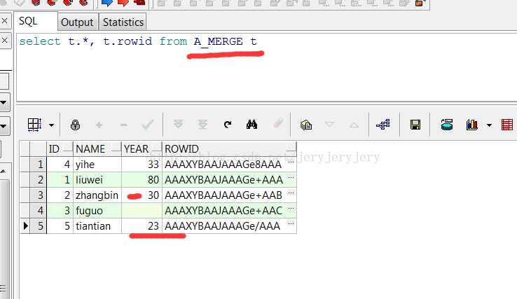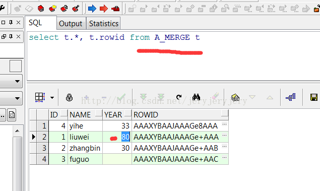 merge完之后A_MERGE表数据截图如下:可以发现仅仅更新了AID=1的年龄,没有插入AID=4的数据