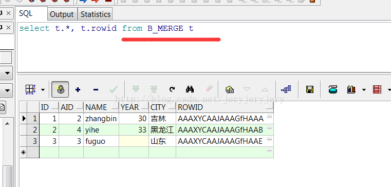 insert into A_MERGE values(1,'liuwei',20); insert into A_MERGE values(2,'zhangbin',21); insert into A_MERGE values(3,'fuguo',20); commit; insert into B_MERGE values(1,2,'zhangbin',30,'吉林'); insert into B_MERGE values(2,4,'yihe',33,'黑龙江'); insert into B_MERGE values(3,3,'fuguo',,'山东'); commit;