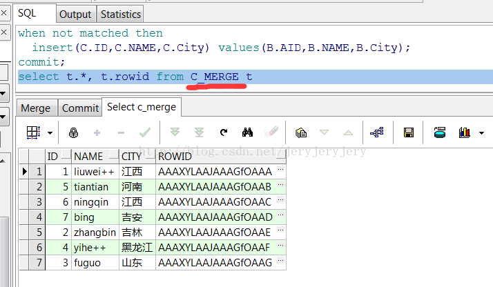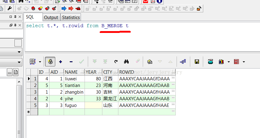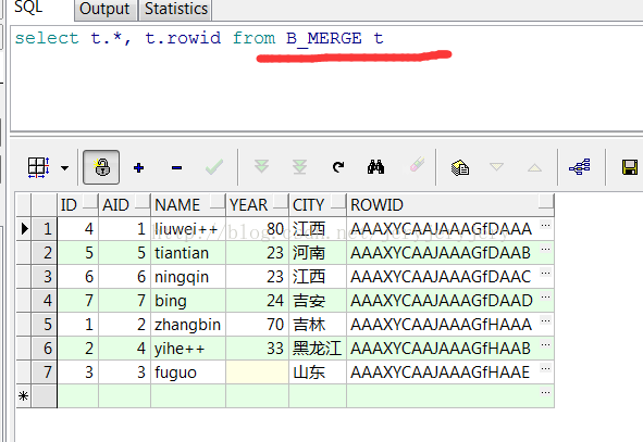 测试数据的sql代码如下,我们在B_MERGE修改了两个人名,并且增加了两个人员信息,但是他们来自的省份不同,