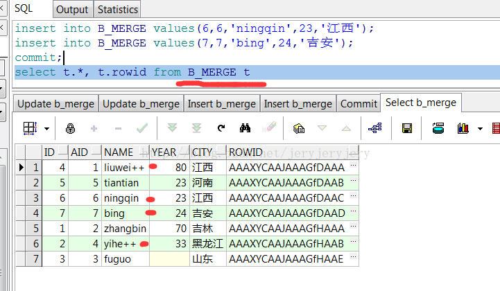 update B_MERGE set name='yihe++' where id=2; update B_MERGE set name='liuwei++' where id=4; insert into B_MERGE values(6,6,'ningqin',23,'江西'); insert into B_MERGE values(7,7,'bing',24,'吉安'); commit;