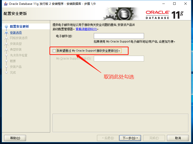 b.安装共分10个步骤。第一步,取消安全更新的勾选,点击“下一步”