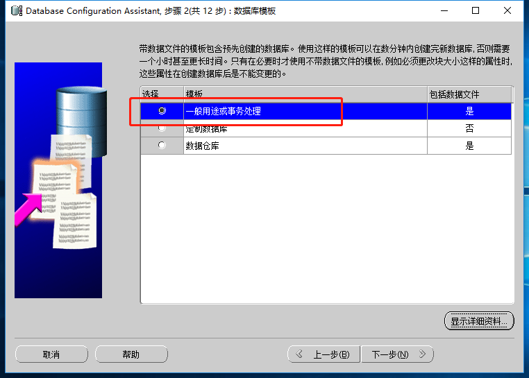 6、安装位置:oracle基目录可以自由设置:D:\app\mldn,选择创建数据库类型。选择“一般用途/事物处理”